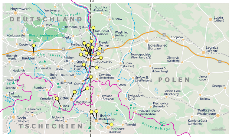 In Zgorzelec und direkt auf dem 15. Meridian liegt die Dreiradenmühle. Dort gibt es viele Gerichte noch nach uralten Rezepten, so wie die litauischen Zeppeline, mit Hackfleisch und Speck gefüllte Teigtaschen. Mutige probieren das „Brotgetränk“, das aus getrockneten Brotschreiben eingekocht wird.